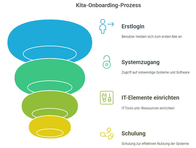 Um einen reibungslosen Onboarding-Prozess zu gewährleisten, sollten sich die Teilnehmer vorab mindestens einmal mit ihren persönlichen Zugangsdaten am PC oder Laptop eingeloggt haben. Im Termin selbst werden wesentliche IT-Elemente wie der Zugang zu KitaPlus, MS Office und dem E-Mail-Programm besprochen und eingerichtet. Dabei wird sichergestellt, dass alle relevanten Passwörter bekannt sind, die Desktop-Umgebung vollständig eingerichtet ist und die notwendigen Druck- und Scan-Funktionen reibungslos funktionieren. Zusätzlich gibt es eine Einführung in die Nutzung von Microsoft Outlook, Citrix, KitaPlus und dem Windows-Explorer, um den Zugriff auf lokale und gemeinsame Laufwerke zu ermöglichen.